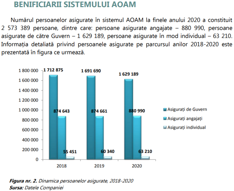 Tot în 2020, statul a avut calitatea de asigurat pentru 1 milion 629 de mii de oameni pentru care a transferat în fondul asigurărilor 3 miliarde 380 mii 472 lei. La aceștia, se adaugă banii cu destinație specială în sumă de 153 de milioane de lei, transferurile pentru programe naționale care constituie 76 de milioane de lei și alte 76 de milioane de lei pentru proiectul „Modernizarea sectorului sănătății”. Conform calculelor, statul alocă pentru o persoană asigurată numai 2.074 lei. Situația s-a îmbunătățit ușor în ultimii ani, întrucât contribuția Guvernului se limita la doar 1.300 de lei per persoană asigurată.