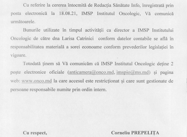 a IMSP Institutului Oncologic de către dna Larisa Catrinici conform datelor