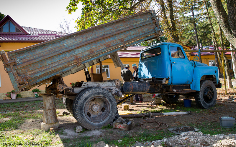La terenul de joacă copii de diferite vârste se joacă cu mașinuțe și tractoare. Unul din băieți, călare pe un tractor mare, îl împinge peste picioarele noastre și râde. „Acest tractor a fost al nepotului meu. Toate jucăriile lui le-am adus aici”, explică Valeriu Isca.