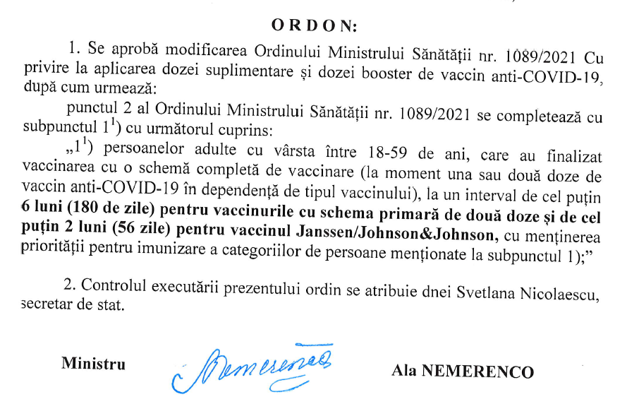 Ministerul Sănătății a făcut modificări la Ordinul nr. 1089/2021, semnat anterior, cu privire la aplicarea dozei suplimentare și dozei booster de vaccin anti-COVID-19.