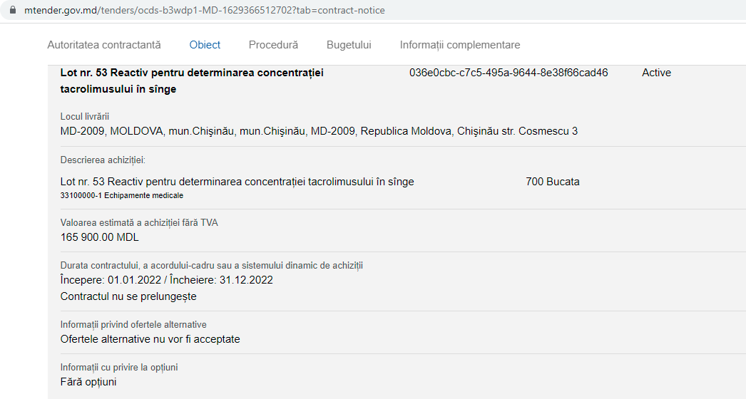 Potrivit platformei mtender.gov.md Centrul de Achiziții a efectuat licitația pentru procurarea a 700 de bucăți de reactiv pentru determinarea concentrației tacrolimusului în sânge încă în august 2021. Valoarea achiziției este de 165.900 de lei și contractul urma să fie valabil pe parcursul anului 2022.