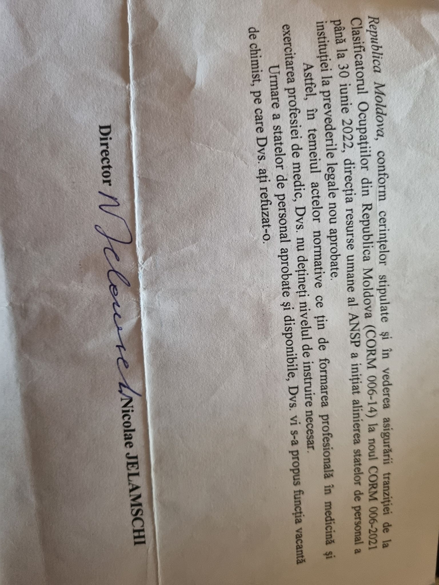 va fi concediată. Ordinul este semnat de directorul ANSP Nicolae Jelamschi și