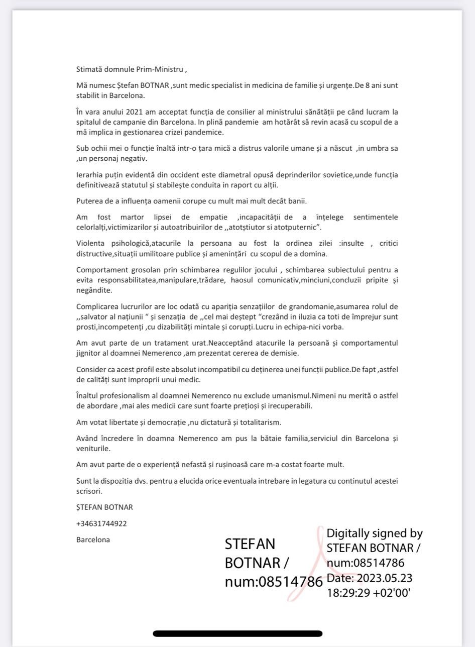 Între timp, Ștefan Botnar a remis o petiție Guvernului și Președinției în care vorbește despre aceleași probleme de atitudine despre care a povestit și în interviul oferit Redacției Sănătate INFO. Drept răspuns, Cancelaria de Stat a remis, cu titlu de informare, ministrei Sănătății scrisoarea și i-a solicitt Alei Nemerenco „după caz, întreprinderea acțiunilr ce se impun pentru soluționarea problemei invocate în petiția dlui Ștefan Botnar”.