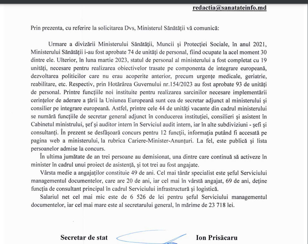 Din 93 de unități de personal aprobate de Guvern pentru Ministerul Sănătății aproape jumătate sunt vacante. Acest lucru înseamnă 44 de specialiști lipsă în acest moment, se arată într-un răspuns al autorității pentru Sănătate INFO.