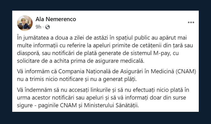„În jumătatea a doua a zilei de astăzi în spațiul public au apărut mai multe informații cu referire la apeluri primite de cetățenii din țară sau diasporă, sau notificări de plată generate de sistemul M-pay, cu solicitare de a achita prima de asigurare medicală”, a scris Ala Nemerenco într-o postare pe pagina sa de Facebook.