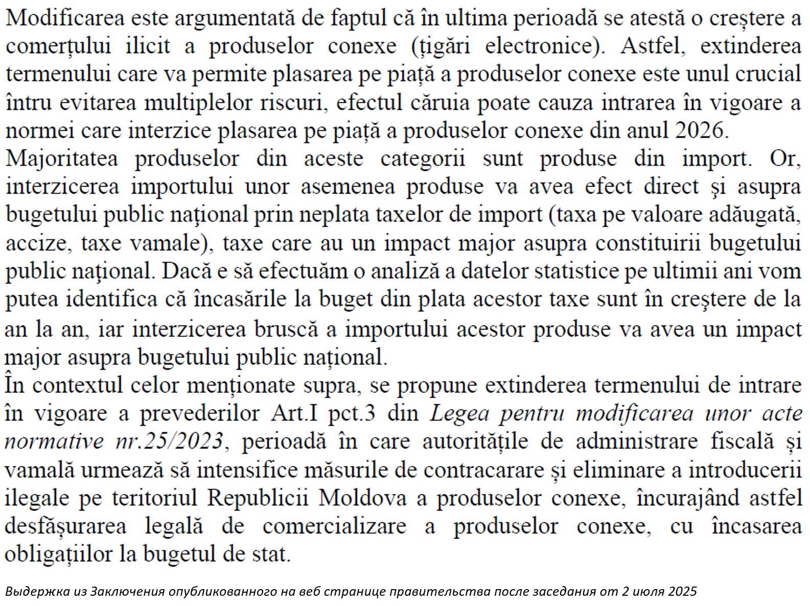 Однако правительство вернулось к той же идее, отвергнутой ранее, вновь представив ее через «черный ход» — лишь в немного измененном виде — и парламент принял ее без реального обсуждения. Парламентская комиссия по экономике, бюджету и финансам, которая подготовила Сводный отчет по законопроекту о внесении изменений в Налоговый кодекс № 1163/1997 и другие нормативные акты (законодательная инициатива № 232 от 18 июня 2025 года), дословно переняла из заключения правительства предложение об изменении закона № 25/2023, которым откладывается вступление в силу запрета на ароматизаторы в электронных сигаретах до 21 марта 2029 года.