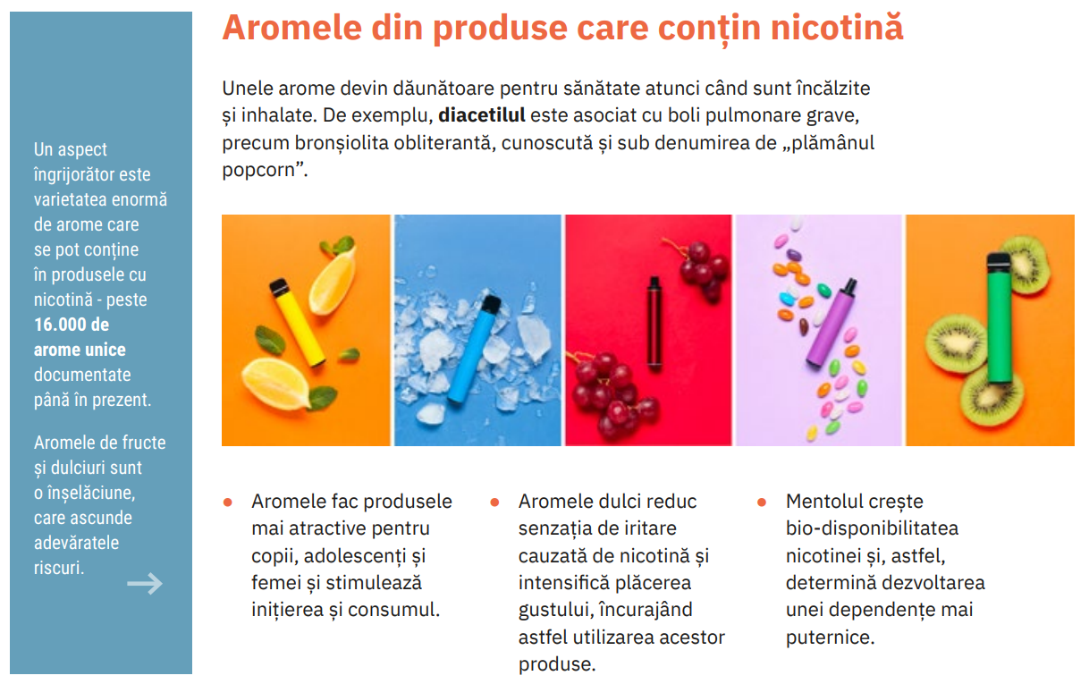 Исследования Всемирной организации здравоохранения и Агентства по контролю за продуктами и лекарствами США (FDA) показывают, что характерные ароматизаторы — такие как клубника, лимон, апельсин, зеленый чай, кофе, шоколад, малина, смородина, черника, торт, бисквиты с молоком, корица, ваниль и т. д. — являются основным фактором привлекательности для подростков. Более 90% молодых потребителей электронных сигарет используют ароматизированные продукты. Исследования показывают, что 71% нынешних молодых пользователей электронных сигарет заявили, что используют их «потому что мне нравятся ароматы». Кроме того, эти ароматизаторы не только облегчают начало, но и поддерживают потребление, приводя к долгосрочной зависимости. В свою очередь, устранение характерных ароматизаторов резко снижает привлекательность для новых потребителей, особенно несовершеннолетних.