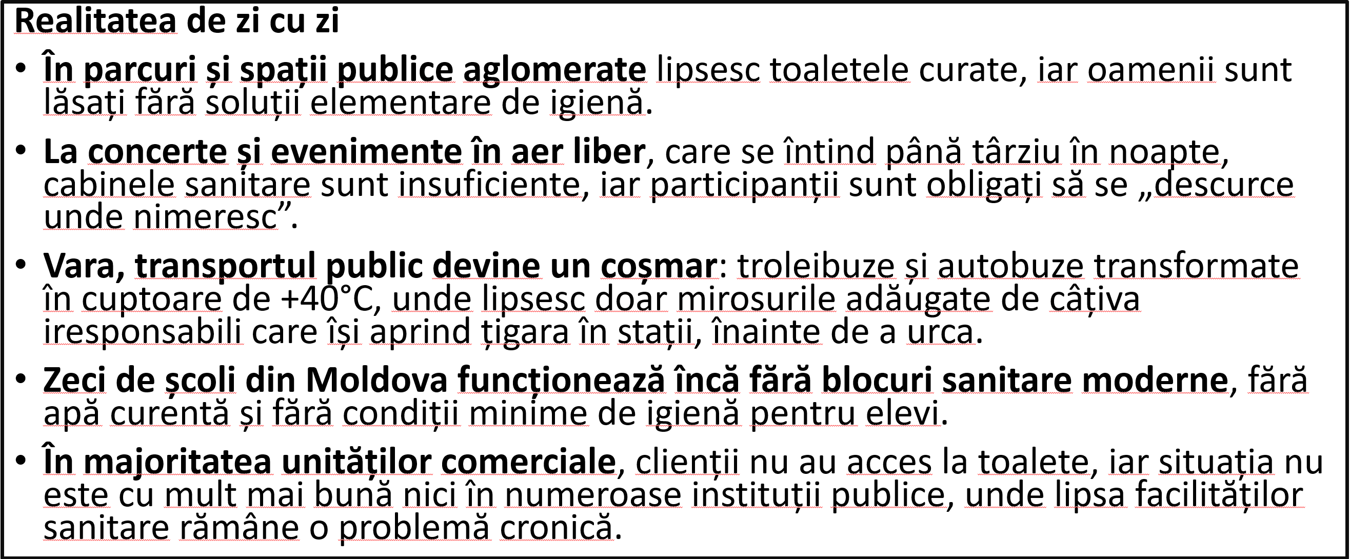 Aceste „promisiuni electorale” se întâmplă în timp ce moldovenii nu au acces la condiții elementare de igienă în spațiile publice – toalete curate, apă sau infrastructură civilizată.