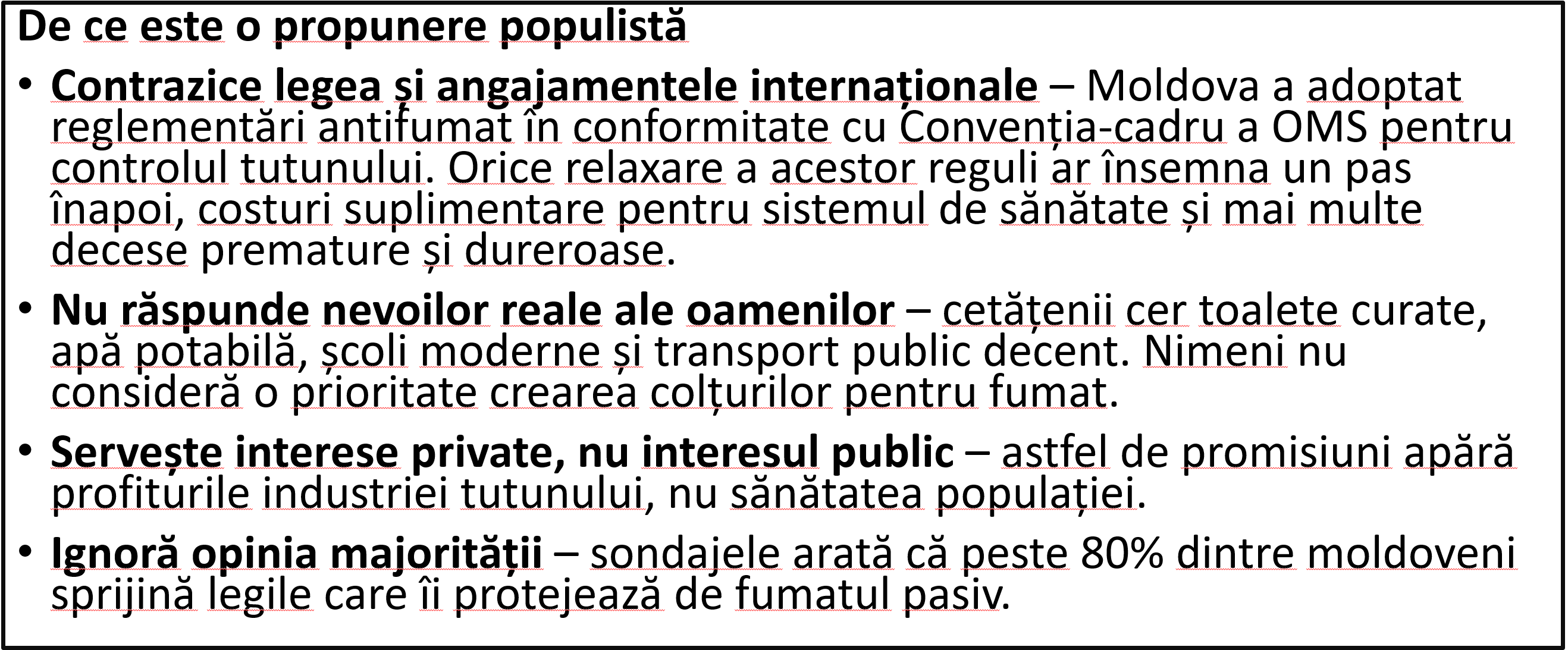 Această prioritate nu servește cetățenilor, care își doresc condiții de igienă și infrastructură decentă. Servește doar industriei tutunului și a bolilor, dar și unor grupuri de interese care profită din relaxarea legilor. În loc să alinieze Moldova la standardele europene de viață sănătoasă și infrastructură publică, astfel de propuneri riscă să mențină țara blocată în trecut, cu priorități distorsionate și politici dictate de grupuri de interese.