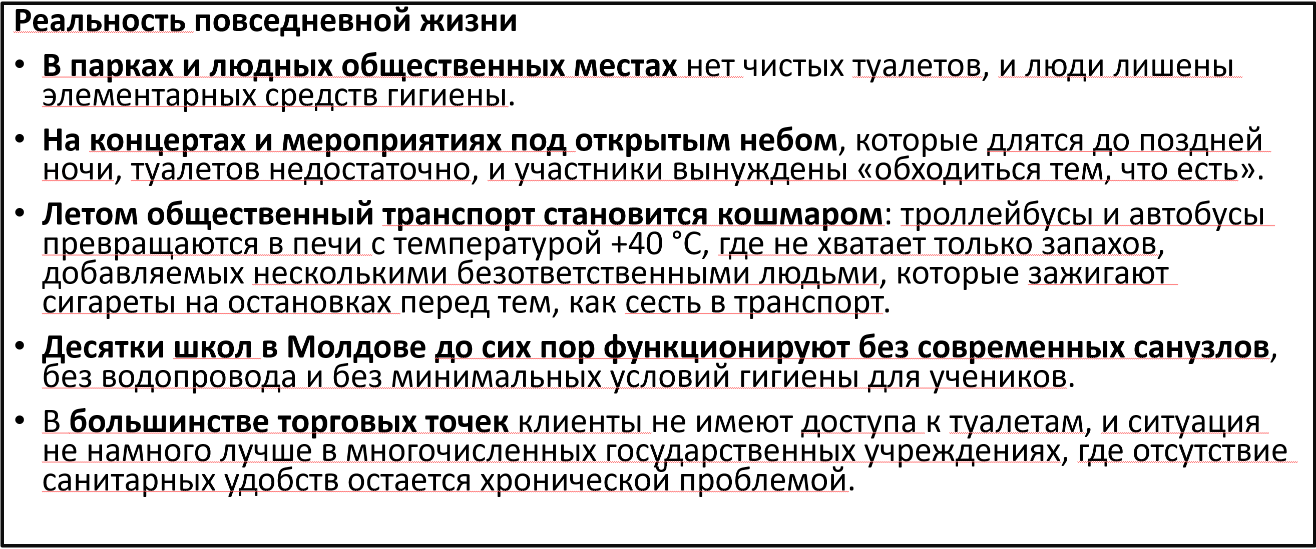 В то время как крупные европейские города инвестируют в инфраструктуру, способствующую здоровому и цивилизованному образу жизни — туалеты и душевые кабины на остановках общественного транспорта, чистые и доступные для всех туалеты, безопасные и ухоженные общественные места — в Кишиневе и других населенных пунктах страны по-прежнему отсутствуют элементарные элементы общественной гигиены: общественные туалеты редки или антисанитарны, остановки общественного транспорта не обеспечивают минимальных условий для пассажиров, а зеленые зоны часто завалены мусором.