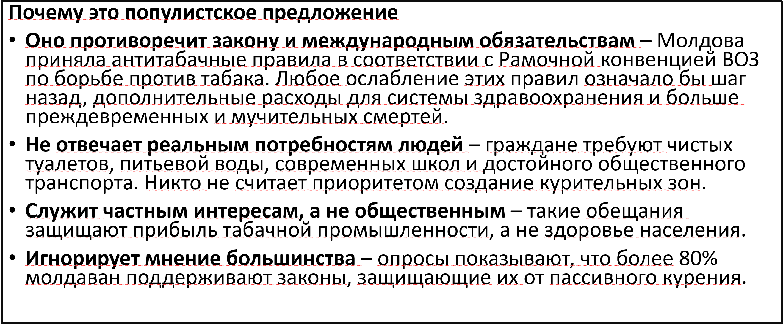 Этот приоритет не служит интересам граждан, которые хотят иметь достойные условия гигиены и инфраструктуру. Он служит только интересам табачной промышленности и болезней, а также некоторых групп интересов, которые извлекают выгоду из ослабления законов. Вместо того, чтобы привести Молдову в соответствие с европейскими стандартами здорового образа жизни и общественной инфраструктуры, такие предложения грозят отбросить страну в прошлое, с искажёнными приоритетами и политикой, диктуемой узкими группами интересов.
