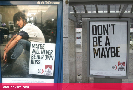Campania publicitară a țigărilor „Marlboro” a fost lansată în Germania în 2011 și prezintă mesaje prin care fumatul este asociat cu independență, asumarea de riscuri, explorare, rebeliune și libertate, aceste atribute fiind extrem de atractive pentru tineri, afirmă specialiştii în sănătate. Printre mesajele difuzate în cadrul campaniei de publicitate sunt „Nu fi un „poate”. Fii Marlboro”. Campania de asemenea includ imagini ce-i duce cu gândul pe tineri la petreceri, aventuri amoroase, muzică, sporturi extreme, precum snowboardul și surfing-ul.