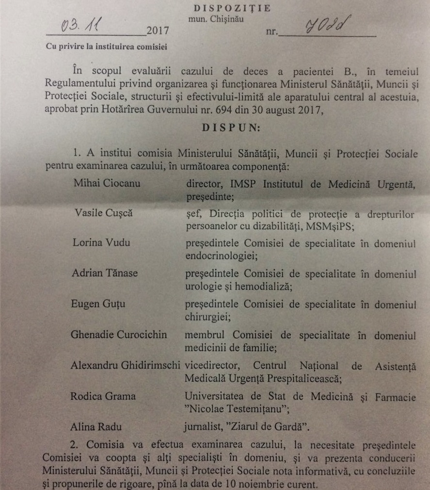 Rând pe rând, am încercat să aflăm de la membrii Comisiei care sunt concluziile decesului. O partre dintre aceștia, care ne-au răspuns la telefon, ne-au spus că s-au obligat să nu divulge date personale și medicale, până Ministerul Sănătății, Muncii și Protecției Sociale va veni cu o poziție. Important este că Mihai Ciocanu, director al Institutului de Medicină Urgentă, președinte al Comisiei, a refuzat să răspundă, atât la apelurile noastre, cât și la mesajele pe care i le-am adresat. Comisia s-a dispersat demult, iar concluzia cu toate părerile formulate se află la minister din data de 10 noiembrie, instituție care și este obligată acum să le facă publice.