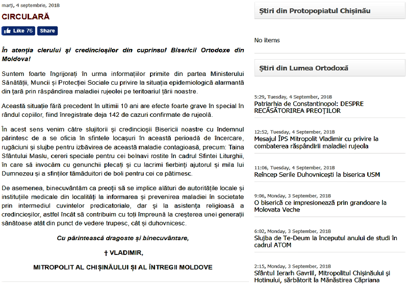 Mitropolia Moldovei a generat reacții de nemulțumire după ce a publicat o circulară prin care cere preoților să oficieze rugăciuni în biserici pentru a „izbăvi” țara de rujeolă, însă se ferește să recomande imunizarea, unica metodă eficientă de prevenire.