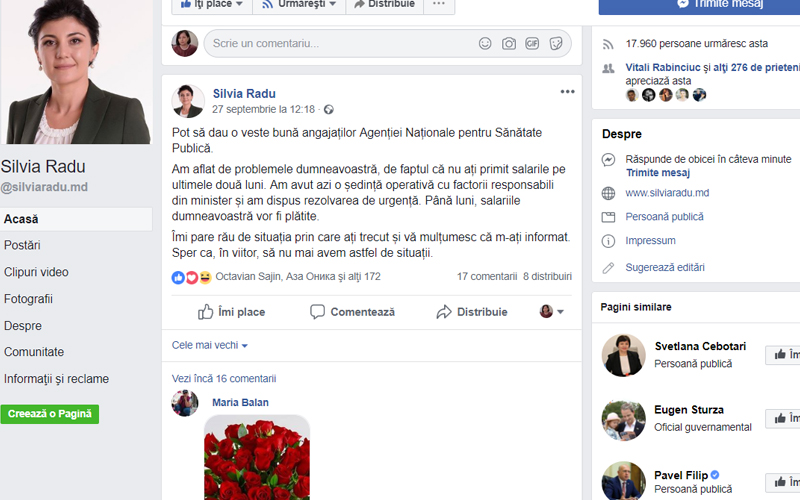 „Pot să dau o veste bună angajaților Agenției Naționale pentru Sănătate Publică. Am aflat de problemele dumneavoastră, de faptul că nu ați primit salarile pe ultimele două luni. Am avut azi o ședință operativă cu factorii responsabili din minister și am dispus rezolvarea de urgență. Până luni, salariile dumneavoastră vor fi plătite. Îmi pare rău de situația prin care ați trecut și vă mulțumesc că m-ați informat. Sper ca, în viitor, să nu mai avem astfel de situații”, menționa Silvia Radu pe pagina sa de Facebook.