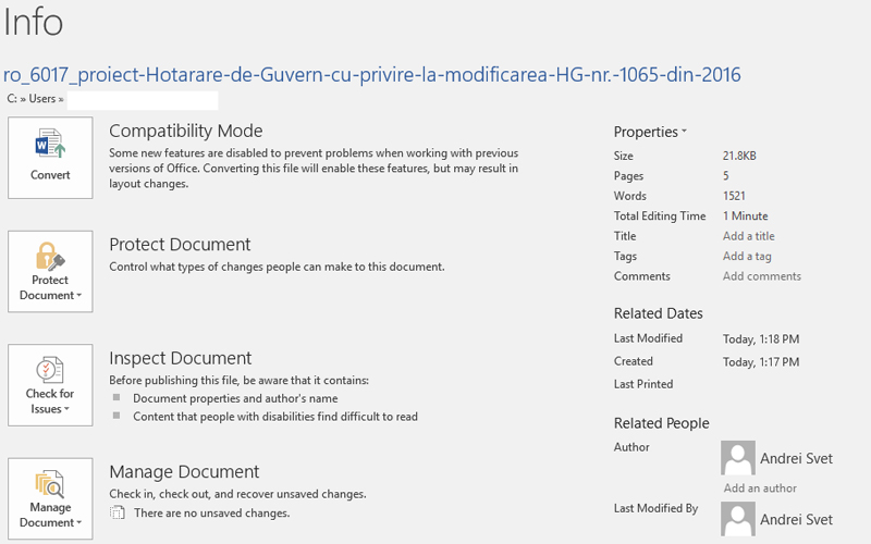 Deși autorul documentului, oficial, e Ministerul Sănătății, se pare că elaborarea acestuia s-a produs în altă parte. Or, persoana care ar fi împuternicită să ofere mai multe explicații asupra documentului este Andrei Șveț, din Direcția Juridică. Din proprietățile documentului se vede că juristul a fost doar un intermediar, care a transmis documentul Cancelariei de Stat pe 6 decembrie, când a fost înregistrat pentru discuții la ședința secretarilor generali de stat.