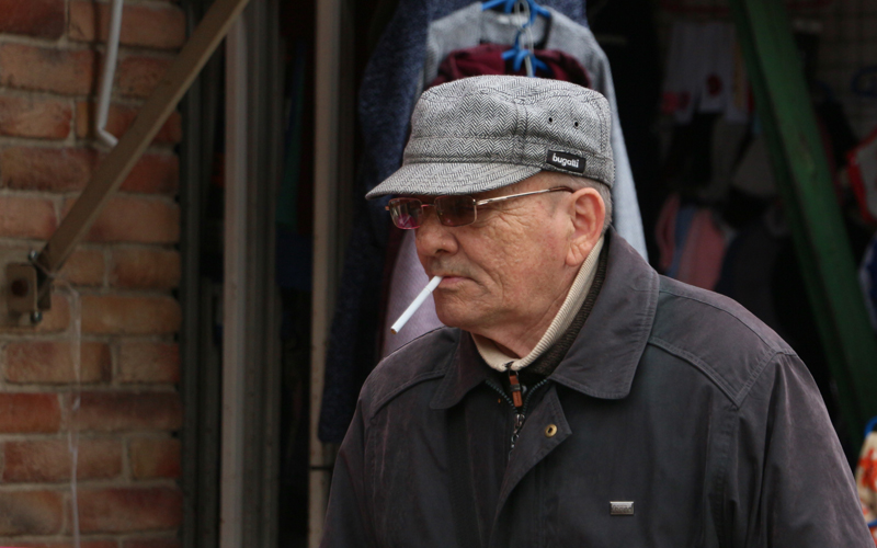 domn care fumează în plină stradă pe unde trec zeci de oameni, dar la o