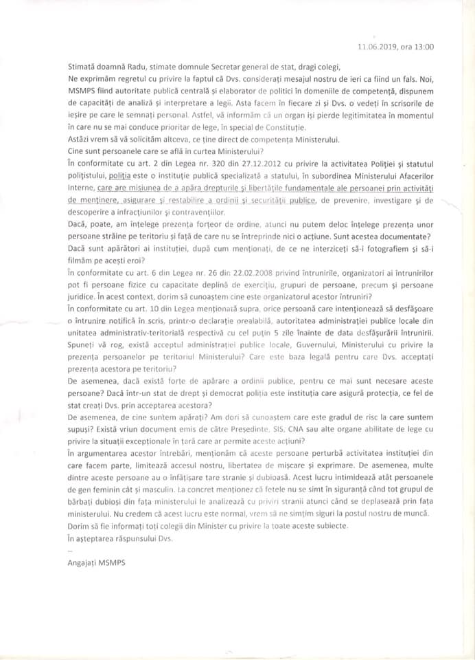 Încă o scrisoare semnată de angajații Ministerului Sănătății, Muncii și Protecției Sociale în susținerea noului Guvern a apărut în spațiul public. Scrisoare e, de fapt, un răspuns dat Silviei Radu, ministru al Sănătății în Guvernul Filip, care a declarat că ceea ce au scris angajații în primul mesaj ajuns în presă, este un fals.