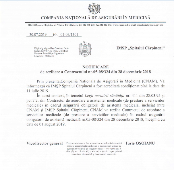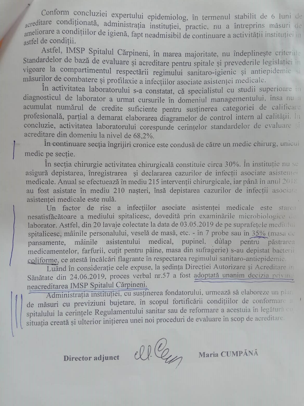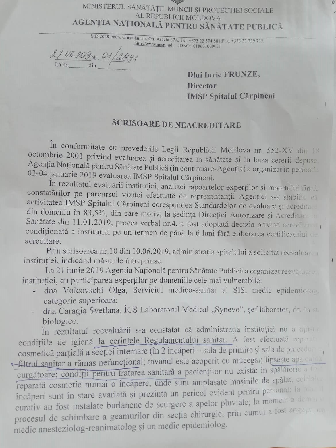 Se pare că problemele sunt mai vechi, dar fostul director, cel care trebuia să bată alarma și-a luat familia și a plecat în România. La 28 decembrie anul trecut, CNAM-ul înștiința spitalul că reziliază contractul de finanțare începând cu 1 august 2019 scrie Ziarul Național. La 21 iunie 2019 Agenția Națională pentru Sănătate Publică a organizat reevaluarea instituției, depistând mai multe nereguli, iar la 24 iunie a fost adoptată decizia privind neacreditarea Spitalului.