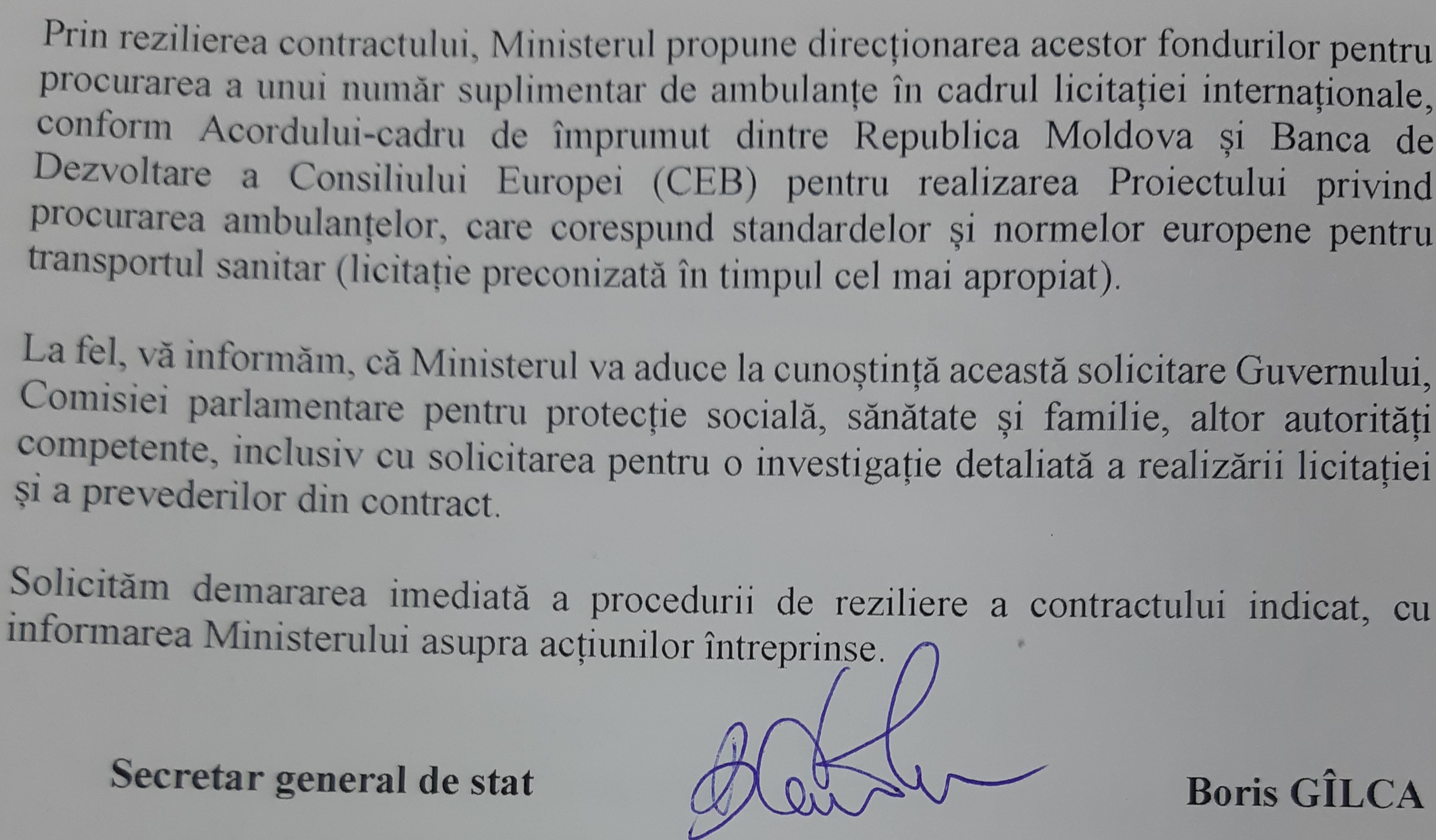 În una din scrisorile pe care le adresa către CNAMUP la începutul lunii iulie 2018, Boris Gîlca cerea instituției, cu titlu imediat, rezilierea contractului cu „Autoritate Grup” SRL „cu plata penalităților la zi, conform stipulărilor din contract”.