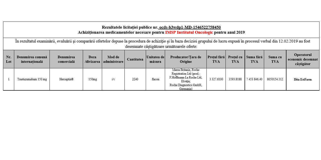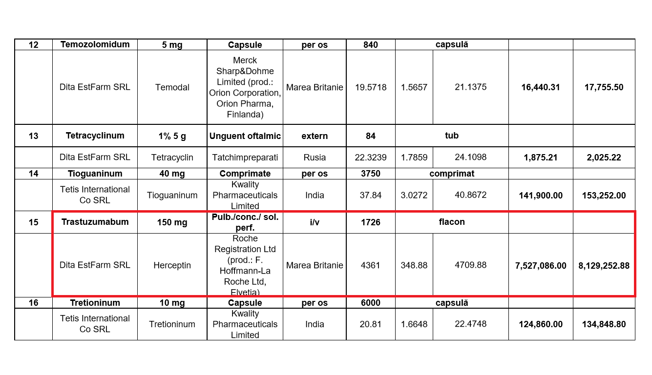 Potrivit datelor publicate de CAPCS, o licitație pentru procurarea medicamentului Herceptin a avut loc într-adevăr în februarie 2019. S-au cumpărat 2.240 de flacoane de Herceptin, cu un preț total de 7,4 milioane de lei fără TVA sau 8 milioane de lei cu TVA. Câștigător a fost Dita EstFarm. Peste nici o lună, în martie, tot Dita EstFarm a procurat Herceptin de încă 8,1 milioane de lei, preț cu TVA, în cadrul altei licitații publice. De această dată, în documentele oficiale apar 1726 flacoane, deși prețul de achiziție a fost mai mare cu 100.000 de lei, decât în licitația din martie.