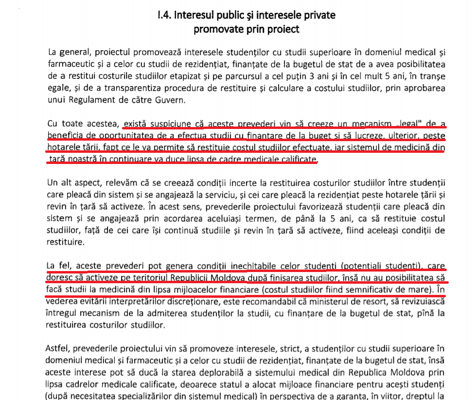 „Există suspiciunea că aceste prevederi vin să creeze un mecanism legal de a beneficia de oportunitatea de a efectua studii cu finanțare de la buget și să lucreze ulterior peste hotarele țării, fapt ce le va permite să restituie costul studiilor efectuate, iar sistemul de medicină din țara noastră în continuare va duce lipsă de cadre medicale calificate”, se menționează în raportul de evaluare a riscurilor de corupție al CNA. Cu alte cuvinte, dacă tinerii își vor face rezidențiatul în altă țară, nu se vor mai întoarce acasă, iar salariul va fi suficient ca să acopere fără dificultăți suma cerută de autoritățile moldovene.
