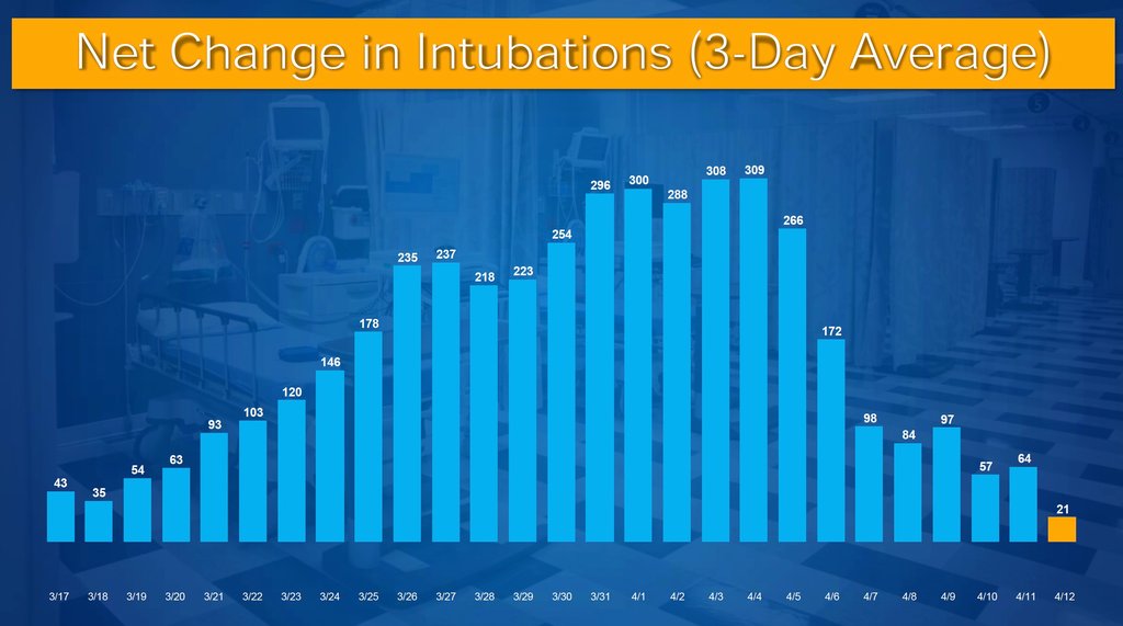 Numărul total de oameni intubați crește acum cu 21 pe zi, în scădere de la aproximativ 300 la sfârșitul lunii martie. Nevoia de ventilatoare mecanice, deși este încă urgentă, a fost mai mică decât a anticipat comunitatea medicală în urmă cu o lună. Un motiv este că, contrar așteptărilor, o serie de medici din spitalele din New York cred că intubația ajută mai puține persoane cu Covid-19 decât cu alte boli respiratorii și că prelungirea timpului în care un pacient este conectat la ventilatoarele mecanice duce la alte complicații grave. Problema este departe de a fi soluționată.
