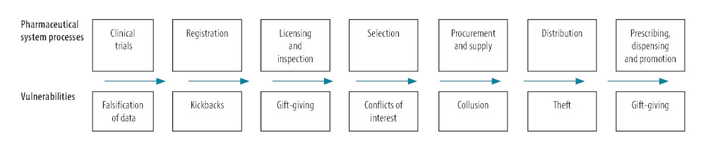 „În absența unei bune guvernări, sistemul farmaceutic, cu numeroasele sale părți interesate și rețele complexe, este deosebit de vulnerabil la astfel de ineficiențe, în special în ceea ce privește pierderile cauzate de corupție. Capacitatea instituțională slabă pentru punerea în aplicare a ghidurilor și a procedurilor de operare standard contribuie la performanțe inadecvate. Mai mult, corupția, care este definită de Transparency International drept „abuzul de putere realizat pentru câștig privat” reduce resursele disponibile pentru medicamente: aceasta reduce capacitatea Guvernului de a furniza medicamente esențiale de bună calitate și contribuie la epuizarea stocurilor și inaccesibilitatea medicamentelor”, constată autorii analizei „Increasing transparency and accountability in national pharmaceutical systems”, publicată în jurnalul OMS.