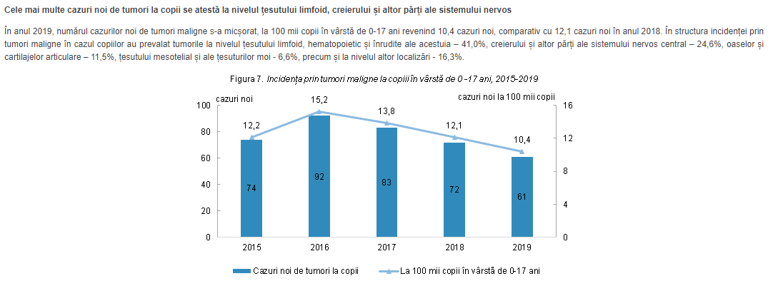 tumori maligne s-a micșorat, la 100 mii copii în vârstă de 0-17 ani revenind 10,4 cazuri noi, comparativ cu 12,1 cazuri noi în