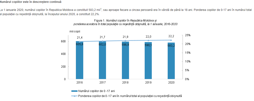 În Moldova se nasc, pe an ce trece, tot mai puțini copii. În 2019, țara a înregistrat cel mai mic număr de copii născuți în ultimii cinci ani la mia de locuitori – doar 12,2 față de 14,5 copii vii născuți la 1 mie de locuitori, în 2015. La 1 ianuarie a acestui an, în Moldova trăiau 583,2 mii de copii cu vârsta până la 18 ani.