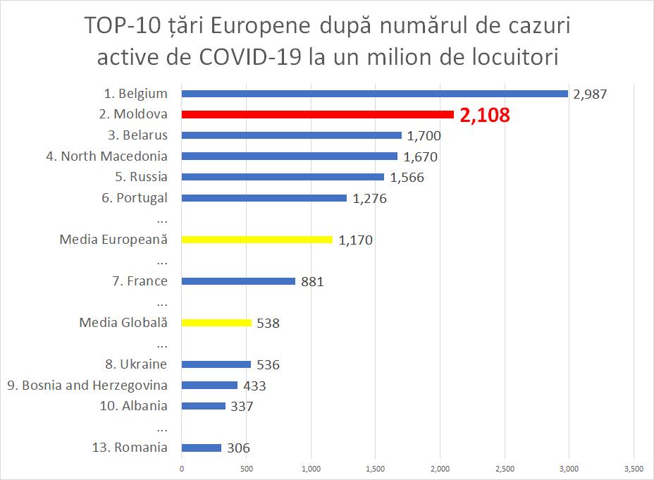 La ora actuală, Moldova se clasează pe locul doi în Europa după numărul de cazuri active de COVID-19 la un milion de locuitori și pe locul 11 în lume.