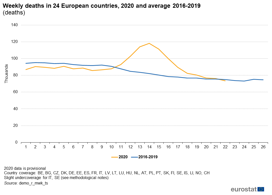 Datele preliminare din 24 de state europene arată că din luna martie până în mai 2020 au fost înregistrate aproximativ cu 160.000 de decese mai mult decât numărul mediu din timpul aceleiași perioade din anii 2016-2019.