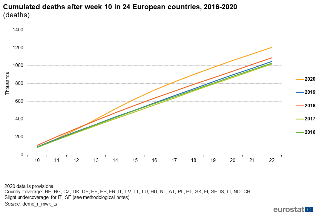 Într-o analiză a evoluției cazurilor mortale în țările europene se menționează că numărul deceselor a crescut rapid în unele state membre ale UE la începutul lunii martie, în unele părți ale continentului diferența față de perioadele din anii trecuți fiind destul de mare. În același timp, conform statisticienilor europeni, unele regiuni nu au fost afectate sever. În total, în țările în care sunt disponibile informații despre evoluția Covid-19, numai în timpul săptămânile 10-22 (martie-mai) ale acestui an au fost înregistrate cu peste 160.000 de decese mai mult decât în aceeași perioadă a ultimilor 4 ani, 2016-2019. Cea mai gravă săptămână a fost a 14-a (30 martie - 5 aprilie 2020). Din datele disponibile, specialiștii au observat că țările și regiunile au fost afectate diferit de acest virus, în funcție de diferite categorii. Spre exemplu, în ceea ce privește vârsta celor decedați, cei mai mulți aveau peste 70 de ani.
