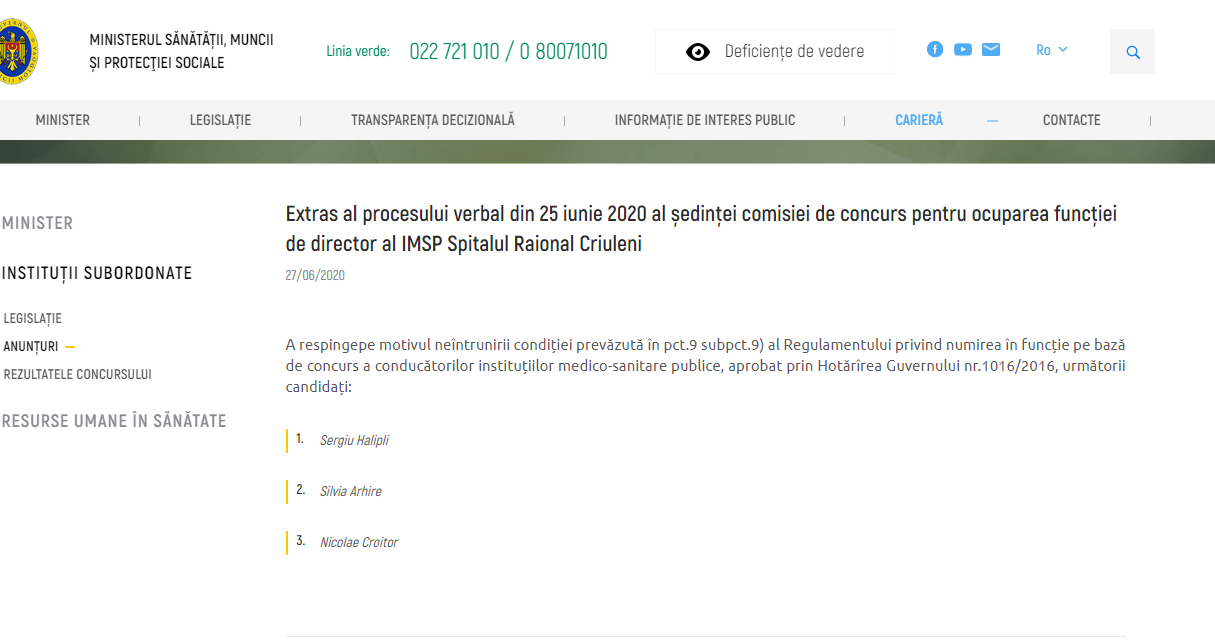 Și la Spitalul Raional Strășeni, unul dintre candidați nu a îndeplinit acest subpunct, astfel, concursul a fost din nou prelungit.