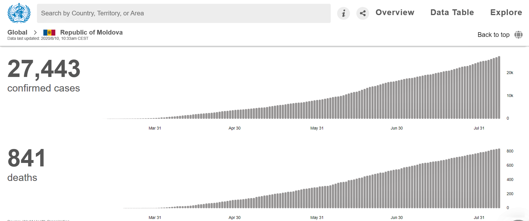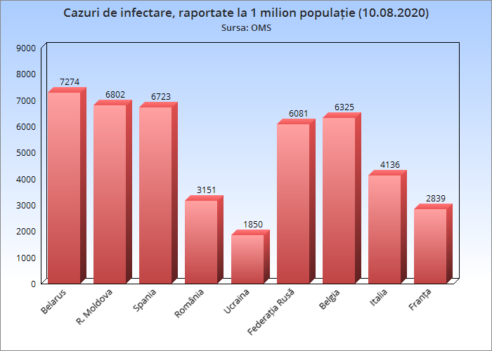 Datele OMS arată că Republica Moldova, alături de România, Ucraina, Belarus, Turcia se află în fază de transmitere comunitară, ceea ce este destul de grav. În ceea ce privește rata de infectare raportată la 1 milion populație, suntem mult peste cifrele raportate de vecinii noștri - de două ori mai rău decât România și de patru ori mai rău decât Ucraina. În ultimele săptămâni, Moldova a depășit Belgia, dar și Spania, țară puternic afectată de coronavirus în valul din luna martie.