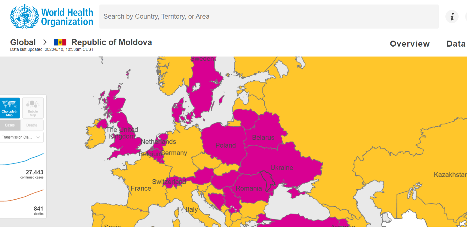 În Republica Moldova totul pare să fie negativ: suntem „colorați în mov”, alături de România, Ucraina, Belarus, Polonia, Turcia etc., ceea ce înseamnă că pe teritoriul nostru există transmitere activă în comunitate. După cum deja am menționat, numărul de infectare este mai mare decât în Rusia, care testează masiv, dar și comparativ cu multe state europene – România, Polonia, Ungaria, Cehia, Slovacia, Austria, Estonia, Letonia, Lituania. Am întrecut chiar și Italia și Spania, lovite de un val violent în lunile martie și aprilie. Acest indicator este mai ridicat numai în Luxemburg, Spania, Belgia, Suedia și Belarus. Majoritatea testează mai mult, comparativ cu Republica Moldova. În general, compararea numărului de teste făcute de către țări este dificilă, deoarece modalitatea de raportare este diferită. În timp ce unele țări raportează „persoane testate”, altele raportează doar „teste făcute”.