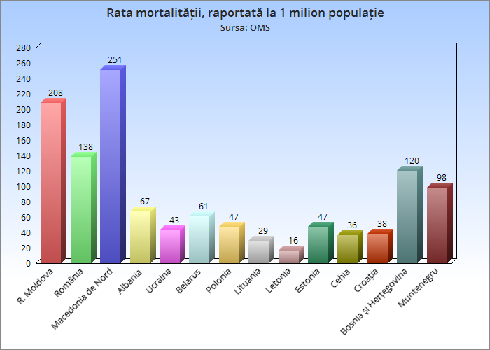 În Republica Moldova rata de deces este mai mare decât în multe state europene, est-europene și asiatice. Evident, în Europa cele mai afectate sunt țările lovite puternic în valul din lunile februarie și martie - Italia, Spania, Suedia, Marea Britania, SUA, Iran. Însă, numeroase state au reușit performanțe foarte bune: Estonia – 47 decese la 1 milion, Letonia – 16 decese la 1 milion, Lituania – 29 decese la 1 milion, Cehia – 36 decese la 1 milion, Croația – 38 decese la 1 milion, Austria – 80 decese la 1 milion populație. În Republica Moldova avem un raport de 208 decese la 1 milion populație, mai rău decât România, unde sunt 138 decese raportate la 1 milion populație. În cifre absolute sunt 841 de moldoveni care au pierdut lupta cu coronavirusul din totalul celor 27.443 confirmați cu acest virus. Conform datelor autorităților până acum s-au făcut în total 166.954 teste, aici fiind incluse testele primare și cele repetate.