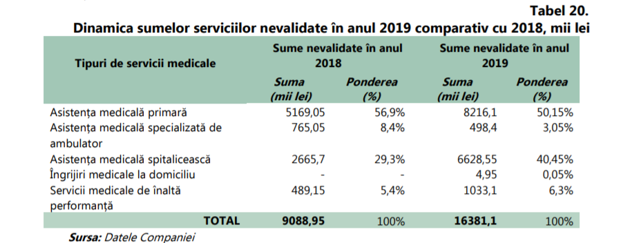 În 2019 însă, potrivit raportului privind executarea Fondurilor Asigurării Obligatorii de asistență Medicală, CNAM a refuzat să finanțeze sau să valideze servicii în valoare de 16 milioane 381, 1 de mii de lei. Evaluatorii au constatat că serviciile „au fost raportate nejustificat sau au fost prestate „sub nivelul cerut al volumului și calității”.