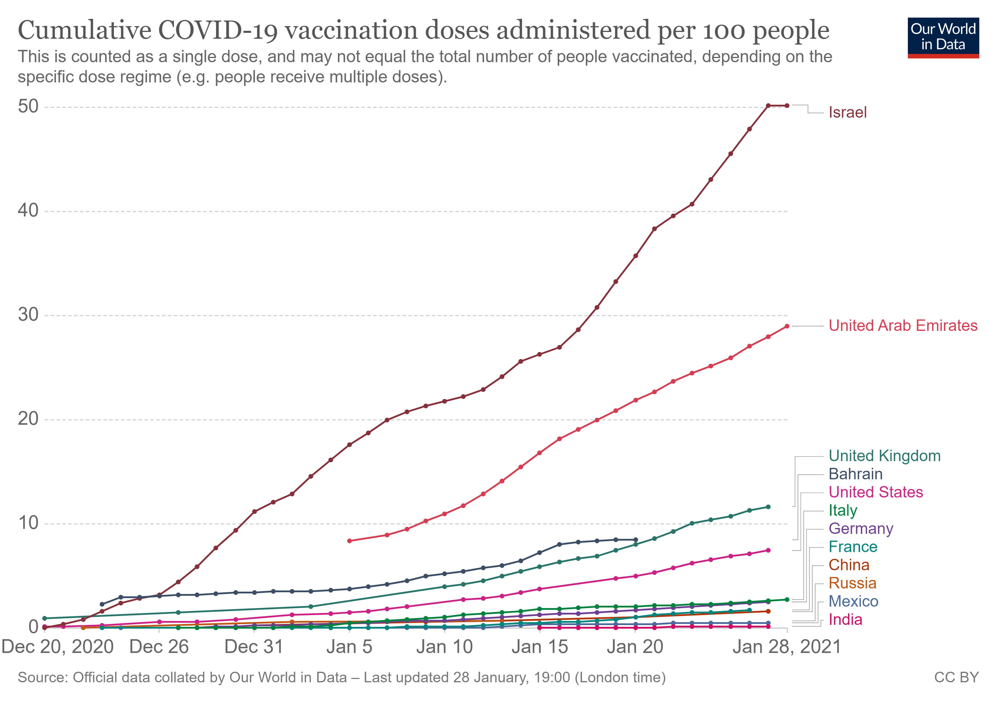 În același timp, Israelul este țara lider la nivel global cu cele mai multe seruri administrate cetățenilor săi – peste 2,6 milioane de oameni au fost vaccinați cu prima doză și 1,1 milioane cu doza de rapel. Israelul vrea să-și vaccineze toți cetățenii cu Pfizer, dar și-a asigurat și doze de la Moderna și de la AstraZeneca, iar jurnaliștii străini se întreabă de ce are nevoie Israelul de mai multe doze decât poate folosi? Israelul a explicat un singur lucru – că nu are scopul de a revinde dozele rămase.