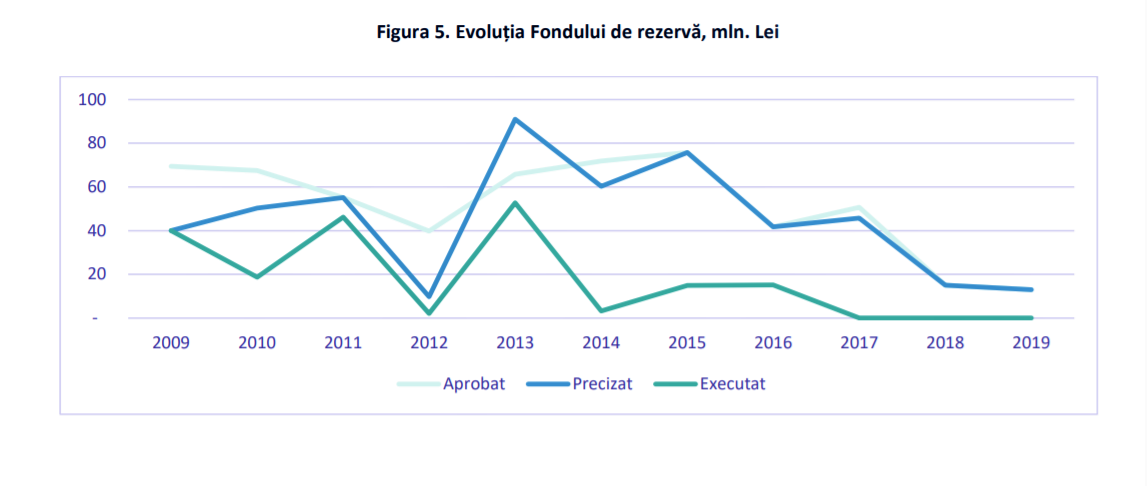 Astfel, autorii analizei constată că executarea fondului de rezervă atestă o tendință negativă, de la 40 milioane lei în 2009 până la 0 lei în anii 2017-2019. În valoare absolută, cea mai înaltă executare a fondului de rezervă a fost înregistrată în anii 2009, 2010, 2011 și 2013, de 40 milioane lei, 19 milioane lei, 46 milioane lei, respectiv 53 milioane lei.