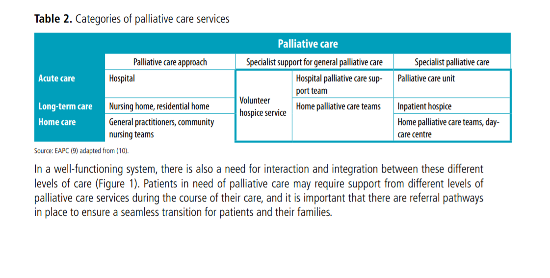 Este important de reținut că serviciile de îngrijire paliativă la diferite niveluri îndeplinesc în cele din urmă o funcție importantă ca parte a unui sistem cuprinzător de îngrijiri paliative.