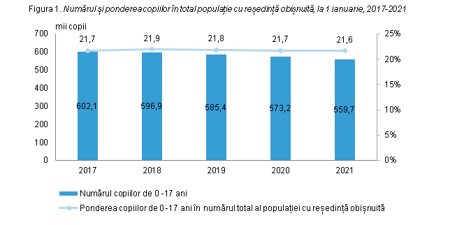 La 1 ianuarie 2021, numărul copiilor în Republica Moldova a constituit 559,7 mii. Asta înseamnă că aproape fiecare a cincea persoană avea vârsta de până la 18 ani. Ponderea copiilor de 0-17 ani din numărul total al populației cu reședință în Moldova era la începutul acestui an de 21,6%.