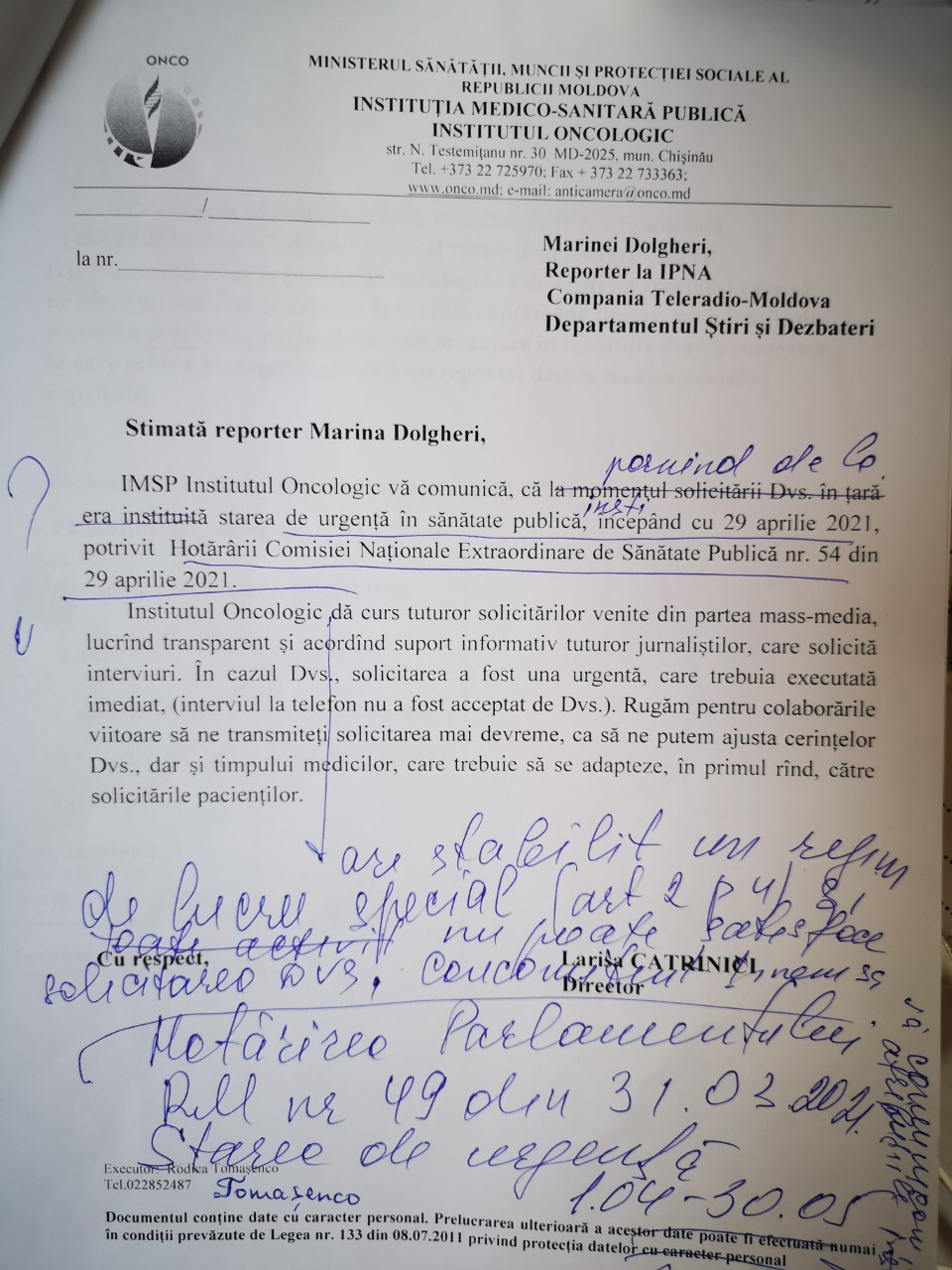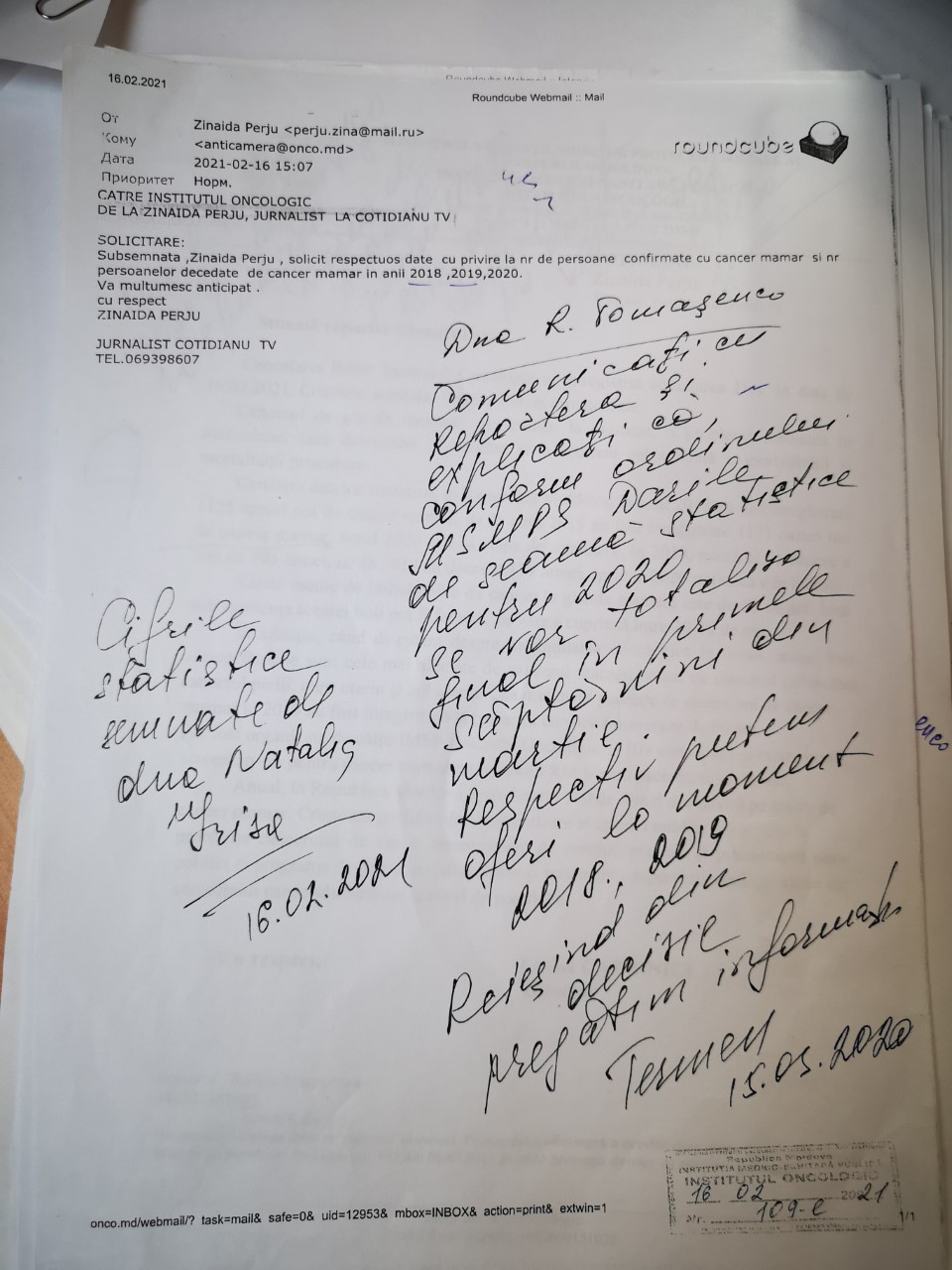 anticamera@onco.md și imspio@ms.md , inclusiv recepționarea, înregistrarea, transmiterea spre soluționare