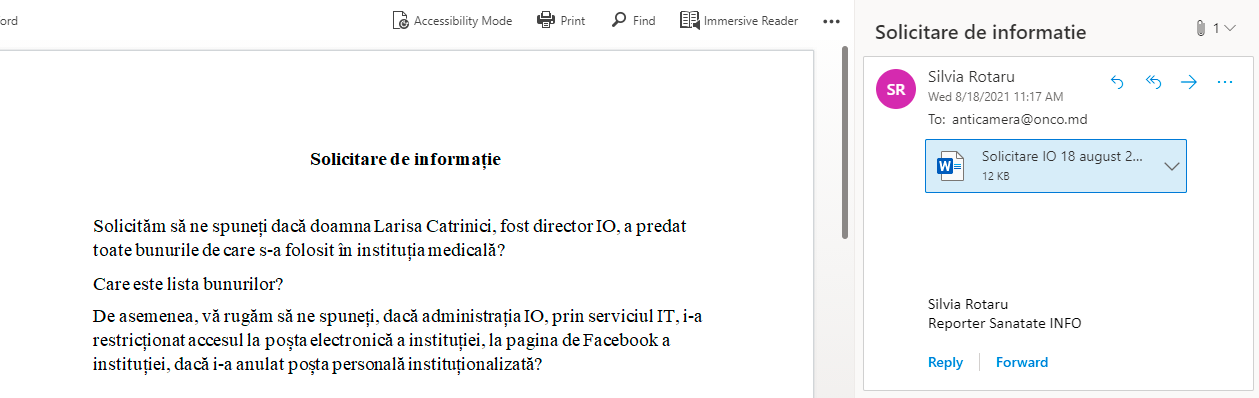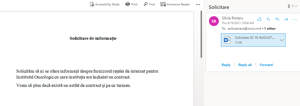 cine e responsabil de administrarea poștei instituționale anticamera@onco.md. Șeful serviciului IT din cadrul IO, Andrei Scobun ne-a spus că aceasta nu e responsabilitatea lui, el ocupându-se doar de reparația calculatoarelor.