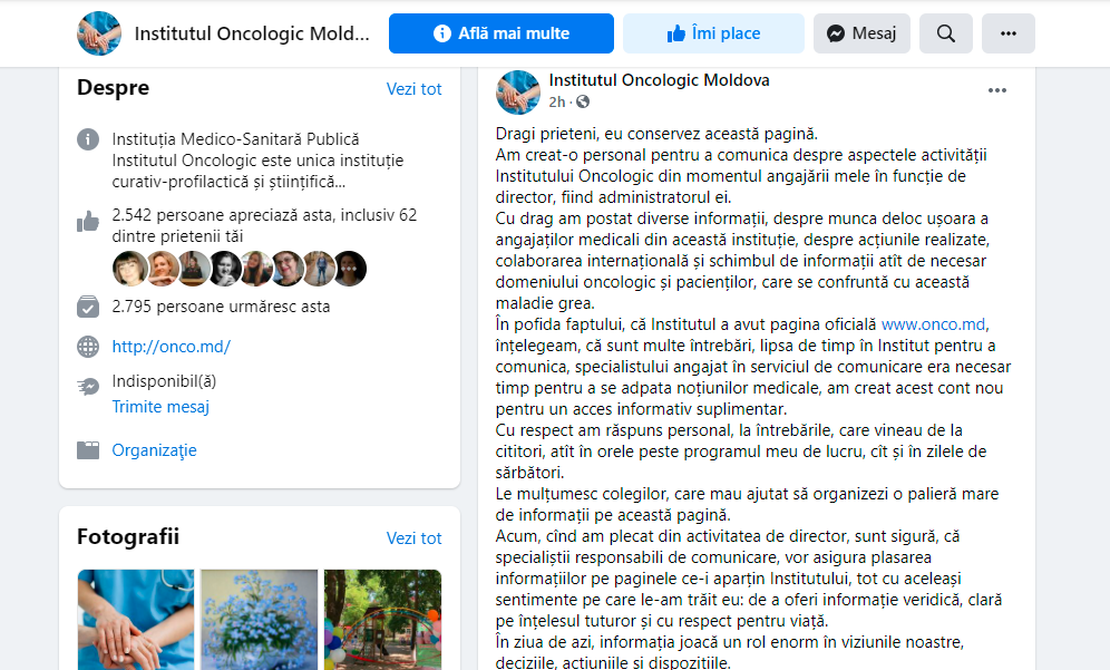 onco.md. Aceasta este pagina oficială pe Facebook și ea nu a fost închisă. A