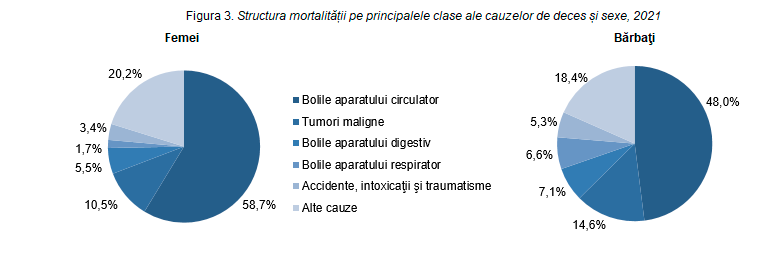 După bolile cardiovasculare, în 2021, 19% au murit în mare parte din cauza bolilor provocate de Covid-19. Alte 12,6 la sută din cauza tumorilor maligne sau cancer, 6,3% - de boli ale aparatului digestiv, 4,4 – din cauza maladiilor aparatului respirator și 4,2 - din cauza accidentelor, traumelor și intoxicațiilor.