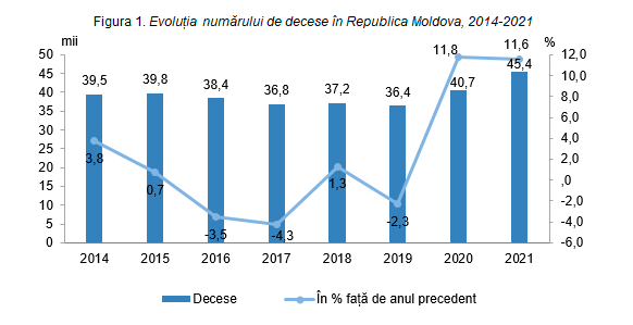 Datele BNS arată că în 2021 bolile au provocat cu 4 mii 721 de decese mai multe decât în 2020. Ar însemna o creștere de 11.6%.