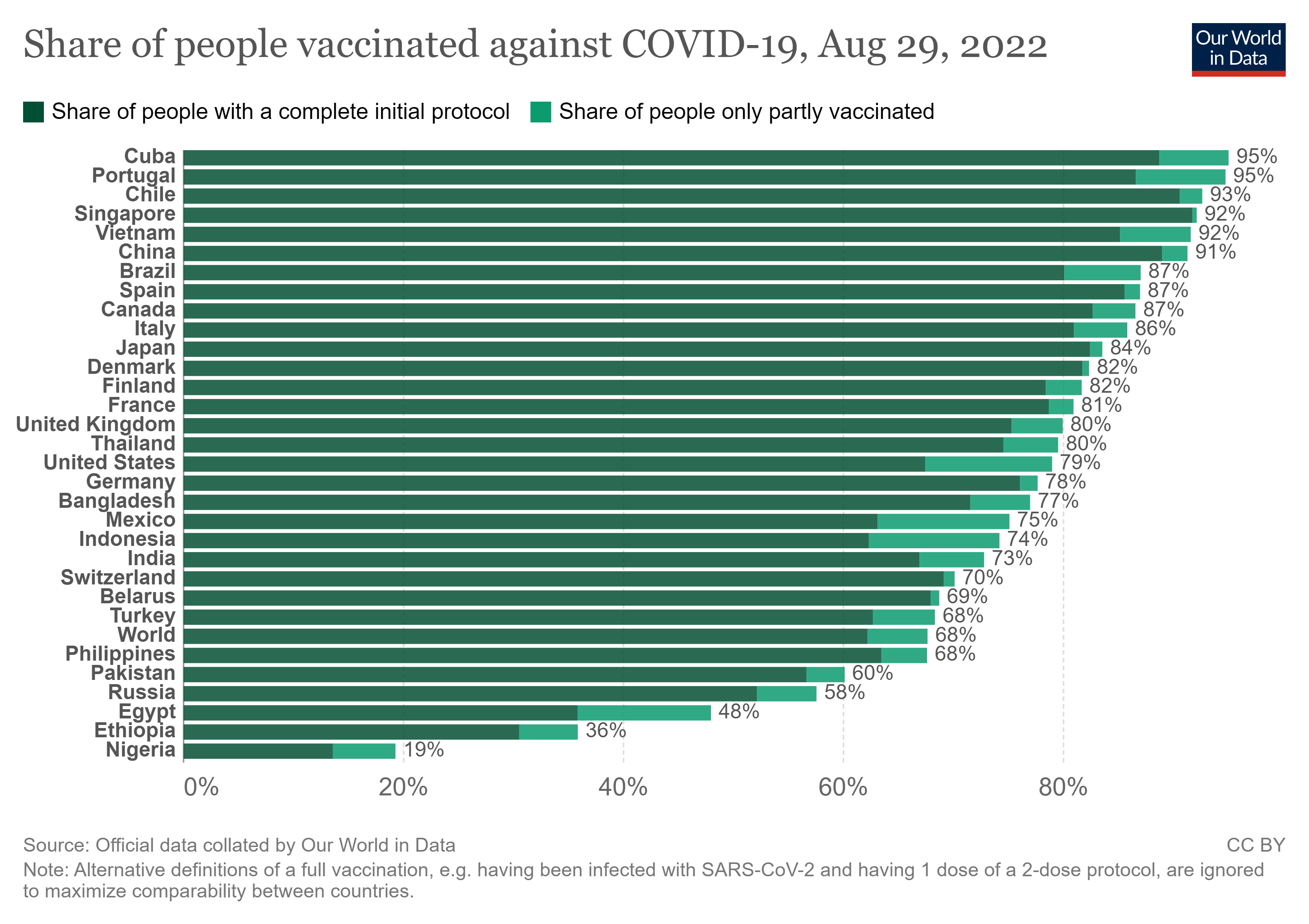 La nivel global au fost administrate 12,57 miliarde de doze, acum fiind administrate 5,1 milioane de doze în fiecare zi. Printre țările cu cele mai multe persoane vaccinate se numără: