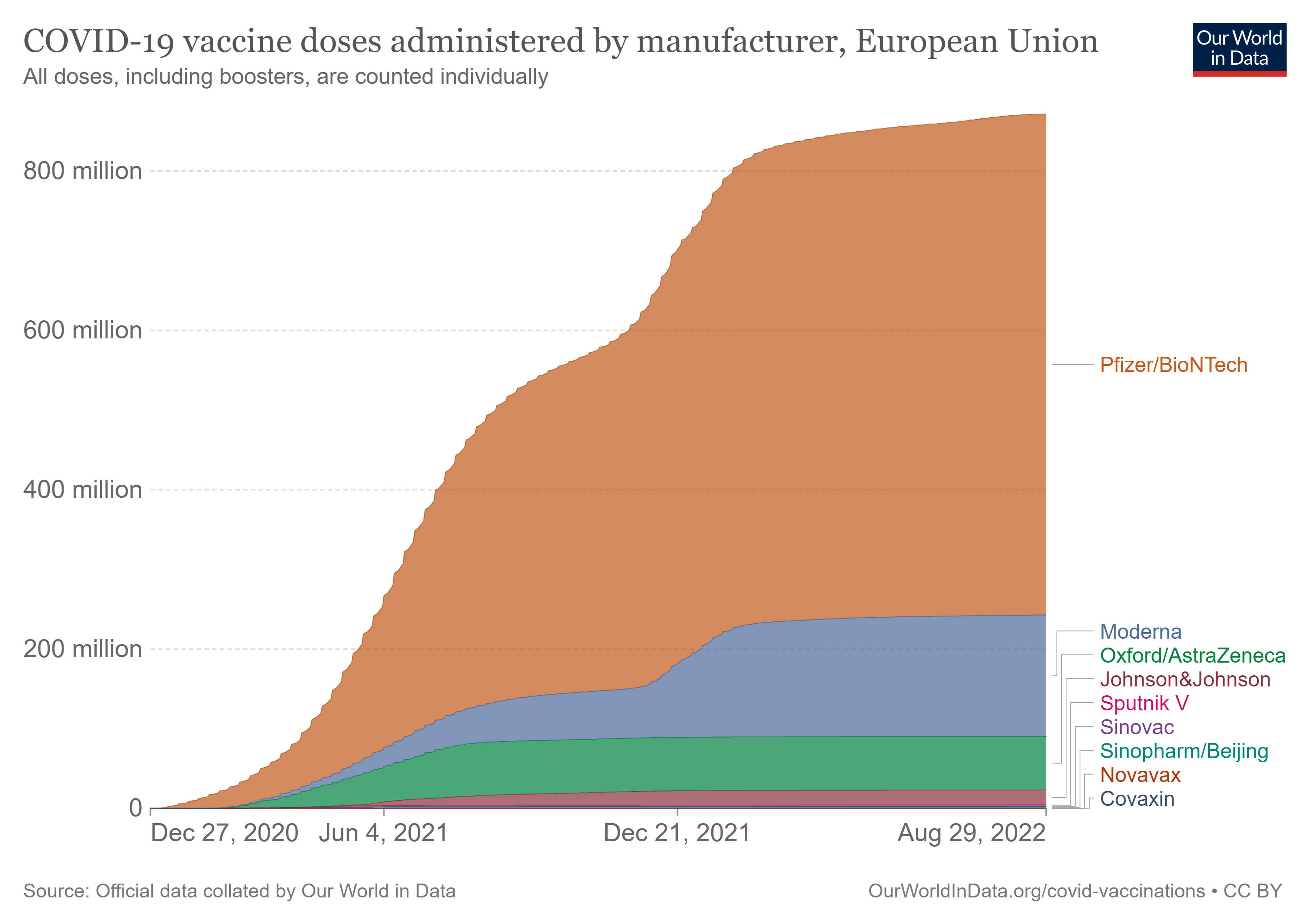 Lideri incontestabili în piața vaccinurilor rămân Pfizer și BioNTech, care au reușit să vândă numai în UE peste 620 de milioane de doze de vaccinuri. Moderna a rămas pe locul doi cu un decalaj puternic și numai 152 de milioane de doze administrate. În același timp, în UE s-au folosit și 1,8 milioane de doze de vaccin Sputnik.