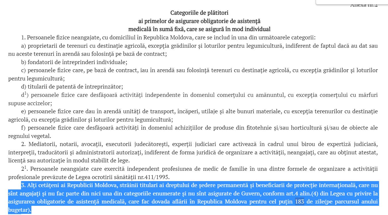 „Cetățenii moldoveni care nu fac parte din categoriile de plătitori ai primei de asigurare în sumă fixă și care fac dovada aflării peste hotarele Republicii Moldova pe o perioadă mai mare de 183 de zile calendaristice în cursul anului bugetar, sunt exonerați de obligativitatea achitării primei de AOAM în sumă fixă pentru anul de gestiune”, se precizează în răspunsul CNAM.